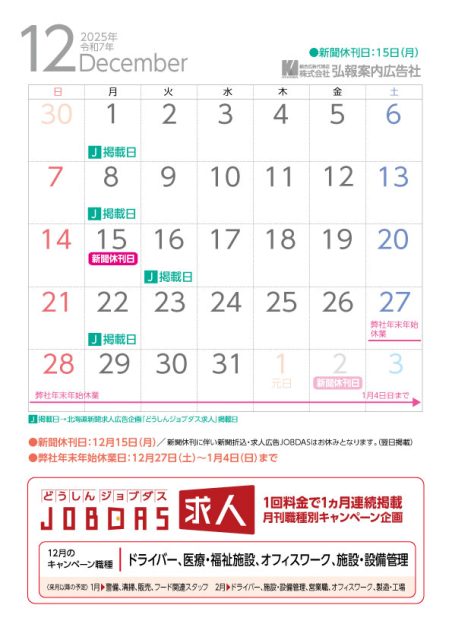 ◎「どうしんジョブダス求人」の年内最終掲載は12月22日(月)です。